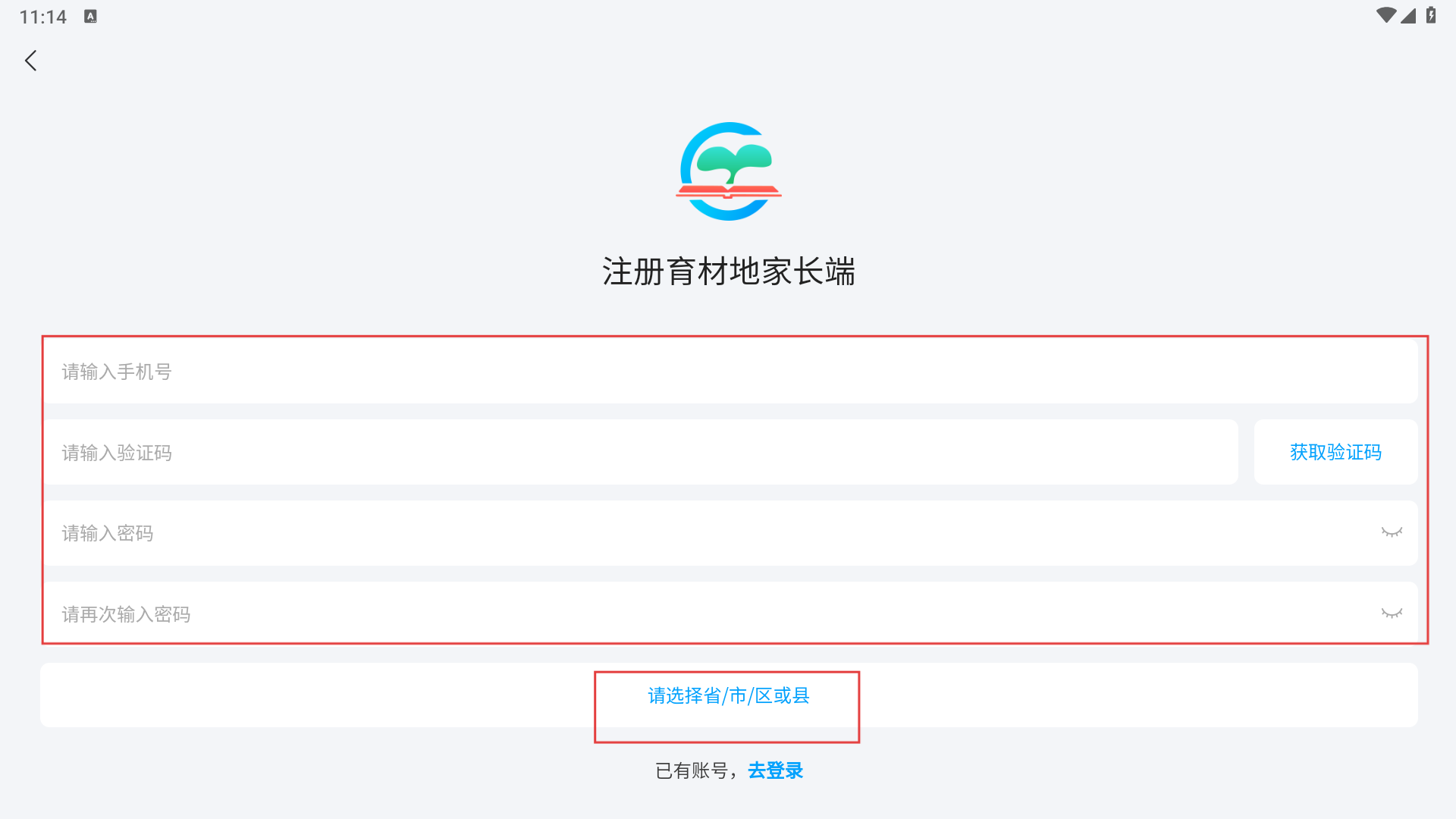 3、若还未注册,点击【去注册】按钮进入注册页面,接着依次填写手机号、获取并输入验证码、设置密码,再选择对应的地区,即可完成注册流程。