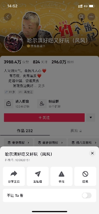 1、首先需要通过抖音关注主播,具体操作方式有几种:可以从页面右侧进入主播的个人主页,然后点击“关注”按钮;或者点击主页右上角的“…”图标进行分享操作;也可以在视频播放界面点击“分享”按钮,复制对应的链接。大家可以任选其中一种方式来完成操作,后续在灰豚数据平台上完成关注流程即可。