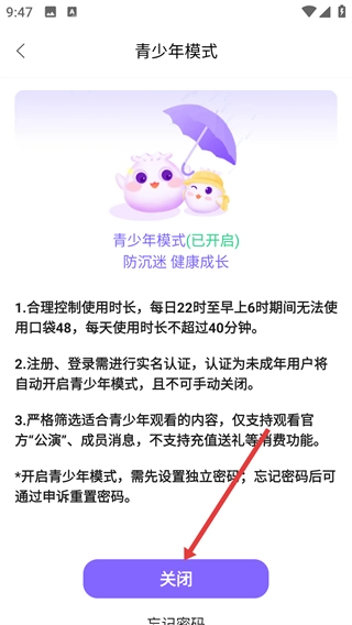 4、进入青少年模式页面后,点击【关闭】按钮,即可关闭青少年模式。