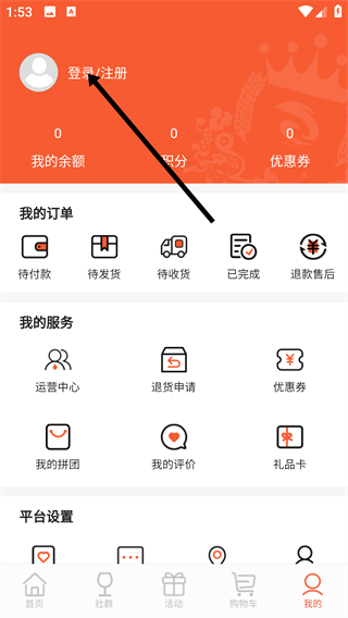 2、进入“我的”页面,点击【登录/注册】选项,进入登录注册界面。
