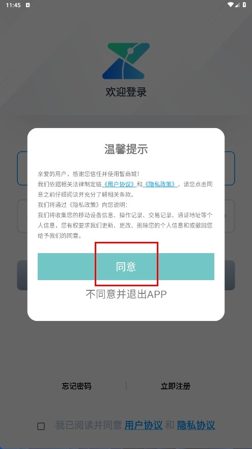 2、点击【同意-功能按钮】,以同意用户协议与隐私政策。