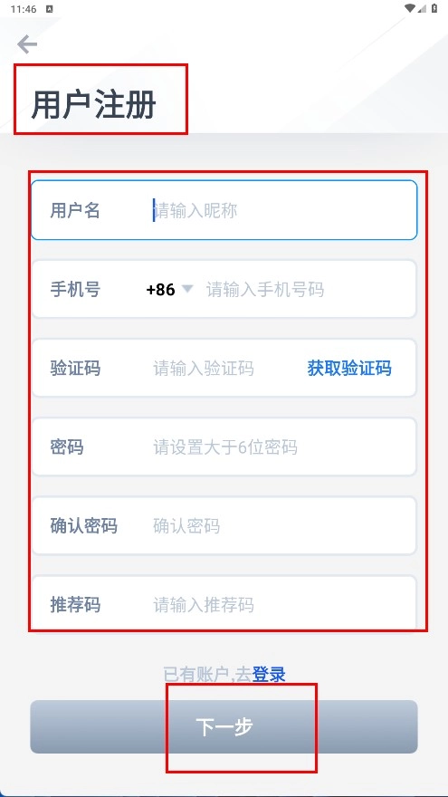 4、若选择注册账号,可在用户注册页面依次输入用户名、手机号码,点击“获取验证码”,设置密码,输入推荐码后点击【下一步】按钮,即可完成注册流程。