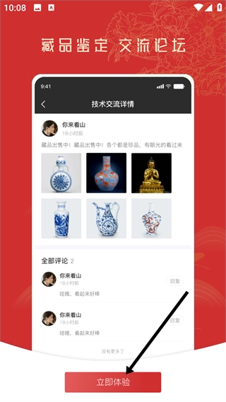 1、进入藏品鉴定交流论坛界面后,点击【立即体验】按钮,即可启动软件的使用流程。