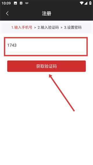 4、进入注册页面后,先填写手机号码,接着点击【获取验证码】按钮,再继续进行后续的注册操作。