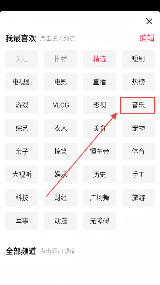 2、在频道选择界面,找到【音乐】频道并点击,即可进入音乐内容页面,尽情享受音乐。