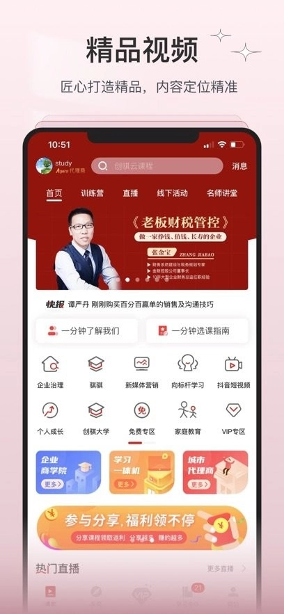 开通个人或企业商学院,即可一站式学习500门以上精品课程,内容覆盖个人成长、职业技能、家庭教育、经营管理、前沿思维、财富自由、新媒体营销、直播短视频等众多领域!