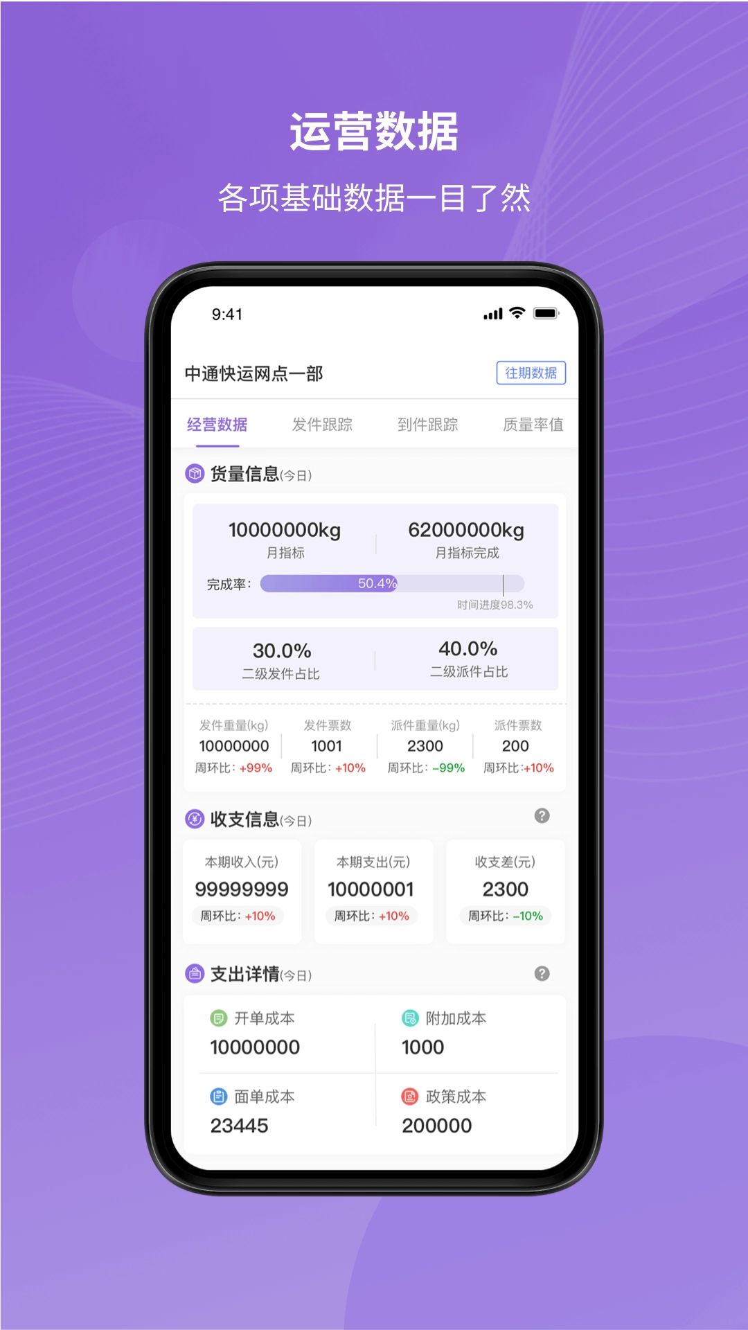 掌上快运配备强大的数据分析功能,可助力您洞悉业务动态,从而做出更精准的决策,实现数据分析对决策的辅助作用。