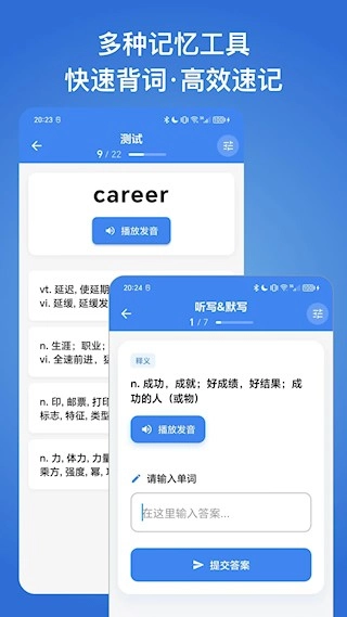 3、丰富多元的学习模式 —— 配备卡片浏览、听力播放、拼写默写等多样化功能,能够适配不同用户的学习习惯与使用场景。