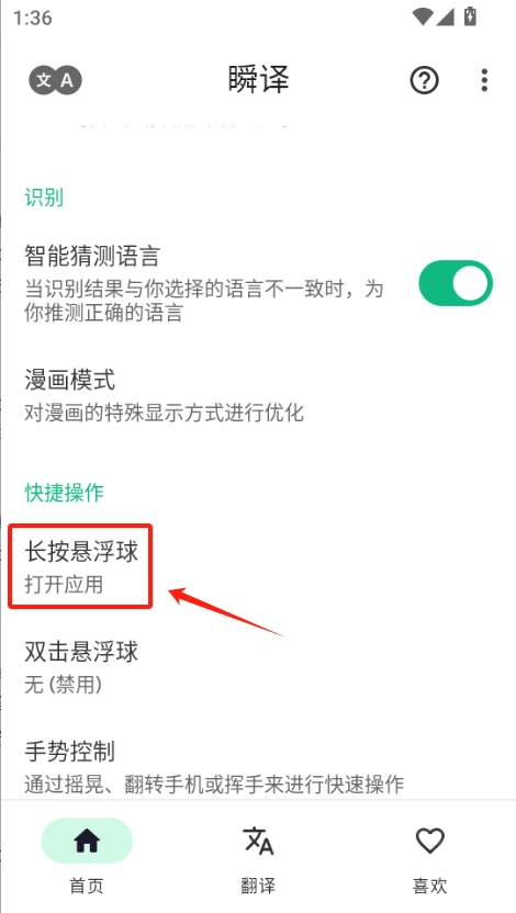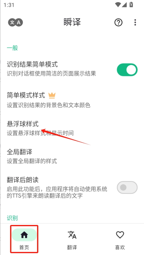 在瞬译的首页,找到并点击设置悬浮球的选项