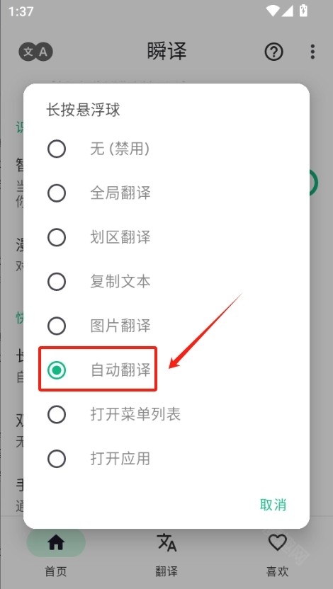 2.在弹出的窗口中,选择自动翻译,这么设置之后就能实时翻译了。