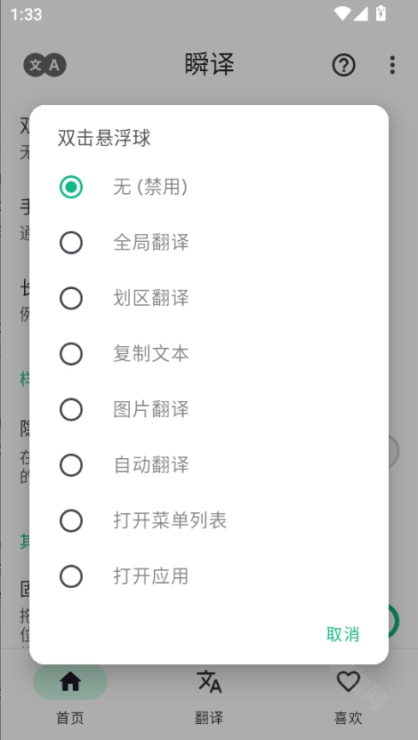 设置好之后,悬浮球就会出现在屏幕上。点击这个悬浮球,就能选择翻译屏幕文本、区域翻译或者图片翻译等功能。