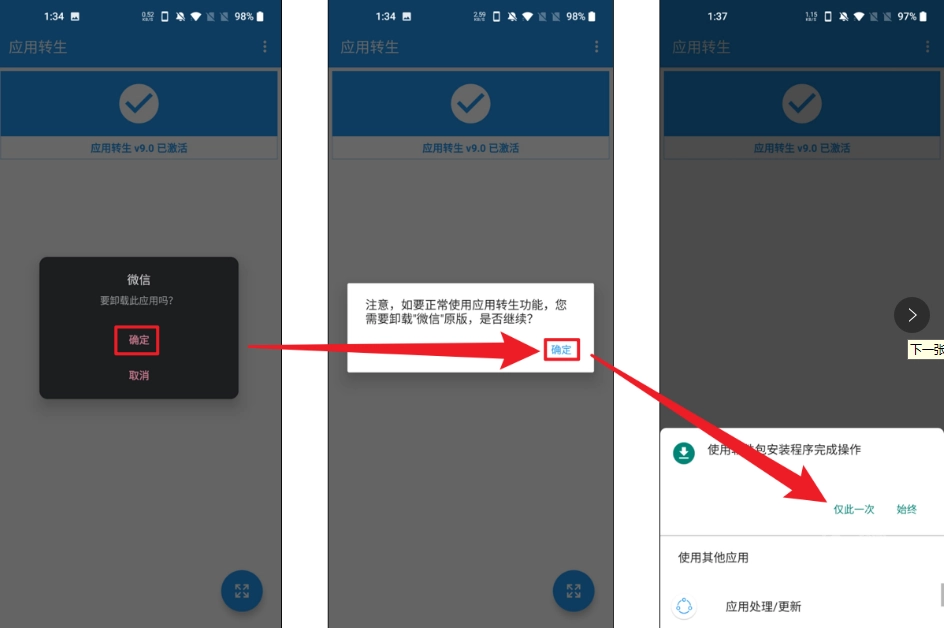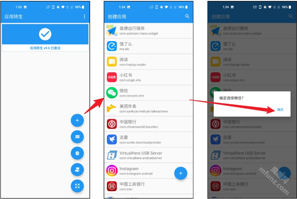 1. 在“应用转生”中添加微信时,软件会提示需要卸载原版微信并重新安装,按提示允许相关操作就行。