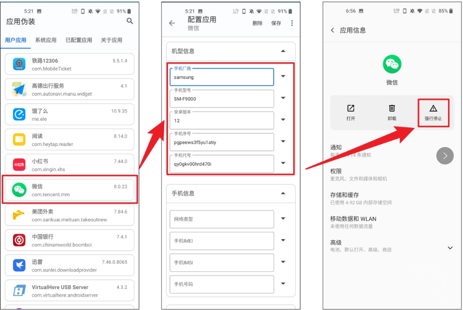 5. 开启应用伪装功能,选择微信应用,将机型修改为平板或折叠屏类型,随机生成手机序列号与代号,完成保存后强制停止微信运行。