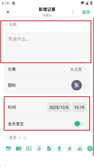2、在新建记事页面填写标题、内容,并设置时间等相关选项。