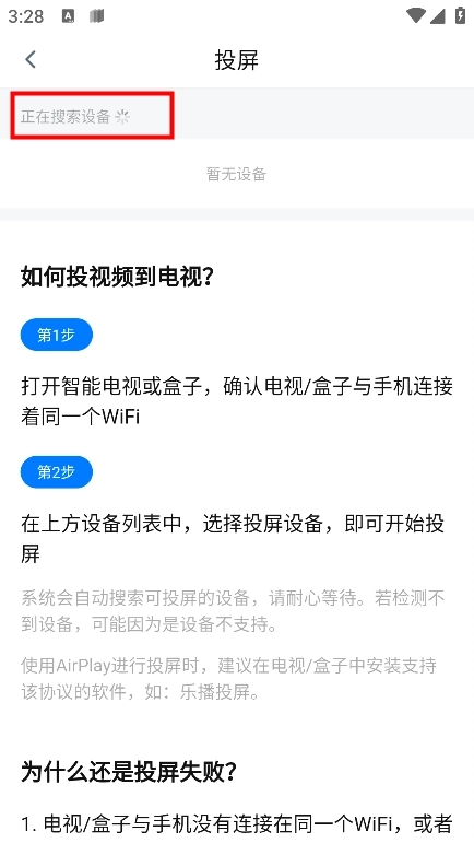 然后选择投屏设备就行啦,要记住哦,手机和用来投屏的电视得在同一个WiFi环境里,不然系统会显示“暂无设备”的提示。