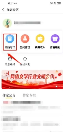 进入作者专区后,点击【开始写作】按钮。