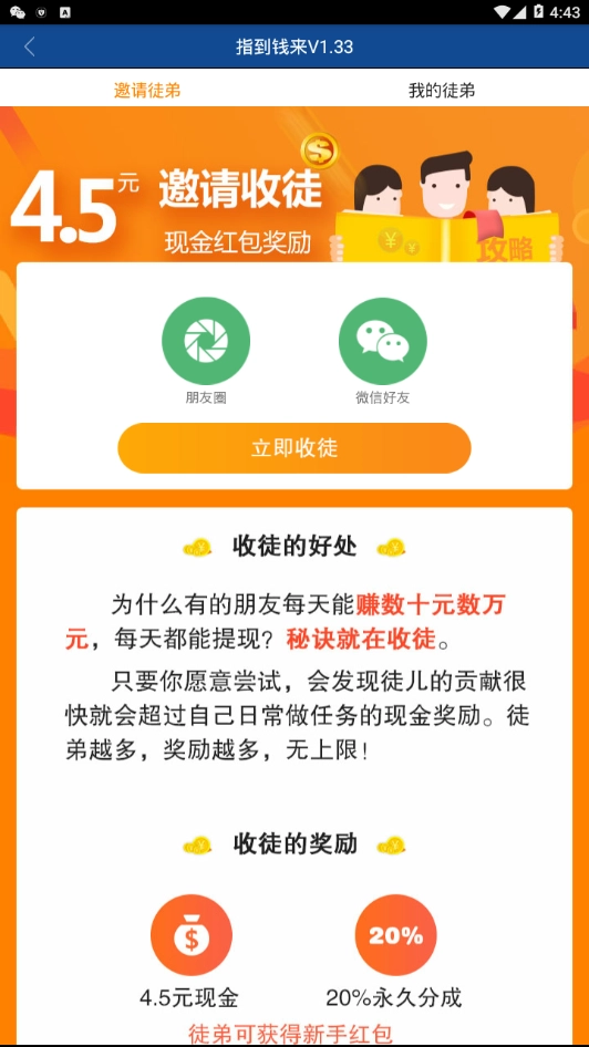 5、【收徒赚奖励】自己招收徒弟即可获取收益,徒弟赚取收益时,自己也能拿到相应分成;
