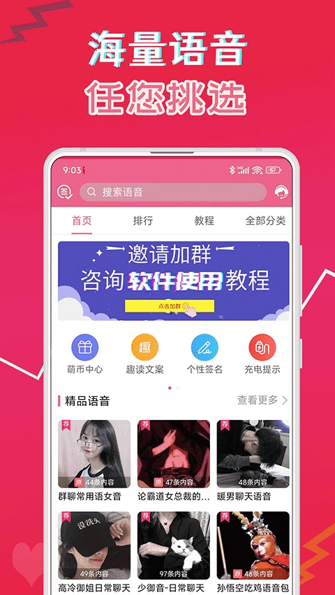 1、这里有着各种各样的声音,网络中流行的语音也有,按照自己不同的需求即可按照类别来找语音;