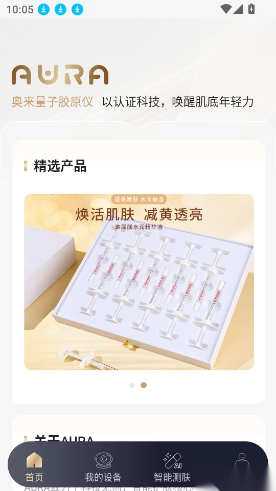 AURA软件中文版是一款提供AI智能护肤管家服务的应用,强大智能设备功能,用户可快捷连接所需量子胶原仪,通过实时蓝牙连接轻松绑定智能设备,进而专业检测皮肤、解析肌肤状态、评估肌肤问题。平台还为用户提供海量精选护肤产品,用户可随心挑选并一键购买,以便更好地实现护肤管理,实时养护皮肤,轻松护理;此外,AURA安卓版支持用户生成个性化护肤方案,方便获取专业方案,有需要的用户不妨来本站使用!