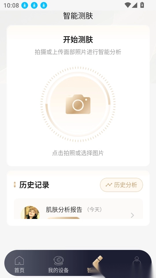 接下来请在“历史记录”里找到并点击“肌肤分析报告”按钮,以便开展后续操作。