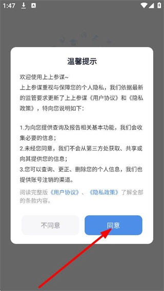 1、在温馨提示弹窗中,点击同意,进入登录页面。