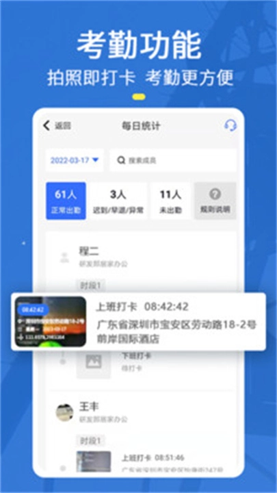 1、考勤功能:通过拍照完成打卡操作,同步记录员工的上下班时间与所在地点,确保考勤数据真实可信且难以被篡改。