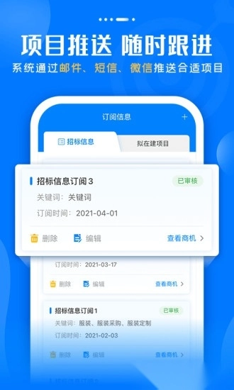 【寻商机】:依据企业资质定制专属项目信息,提供信息推送的商务服务,助力企业及时获取权威渠道发布的全面、实时招标采购信息。
