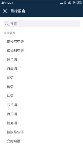 3、之后选择你要翻译的目标语言,如德语、波兰语、俄语、丹麦语、英语、韩语、法语、日语等多种语言;