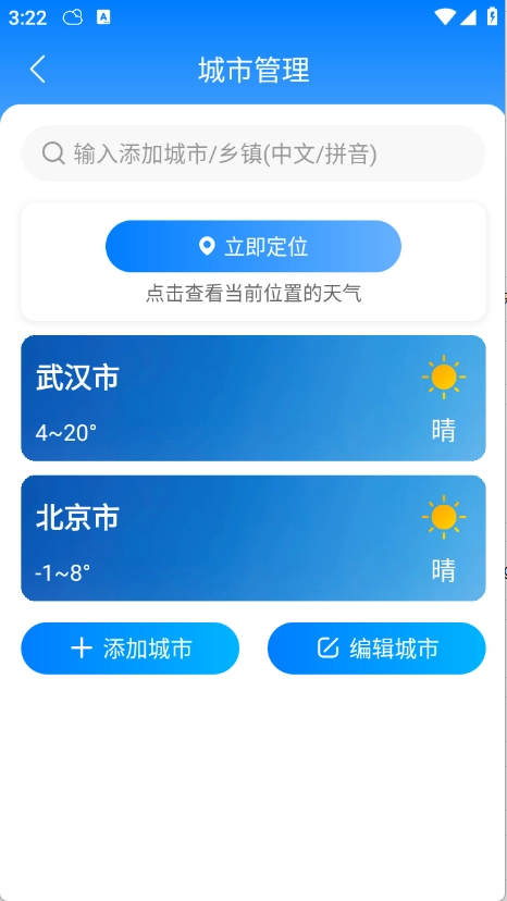 1、城市管理:自动定位当前位置,手动添加需求城市,查询天气更快捷,管理城市更方便。
