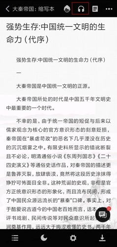 2、轻轻触碰手机屏幕,将会弹出以下页面,点击右上角的戴耳机按钮,就可以进行听书了;