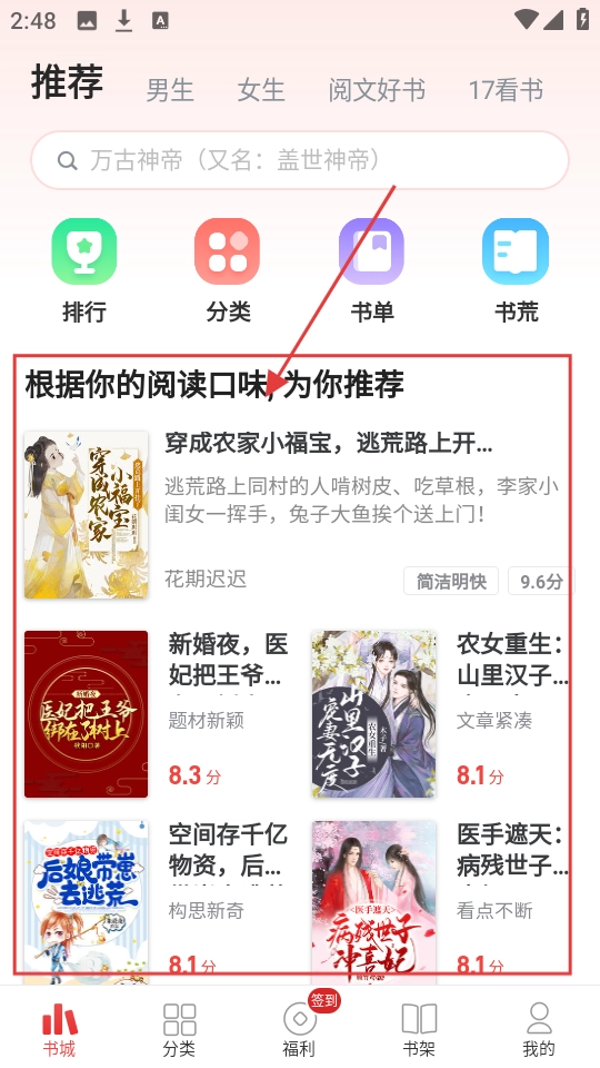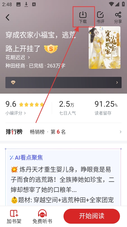 1、我们进入软件,能看到根据阅读口味推荐的小说,若对《穿成农家小福宝,逃荒路上...》感兴趣,点击它就能进入小说详情页面啦。