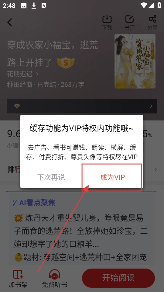 2、在《穿成农家小福宝,逃荒路上了》详情页,若想小说,点击【】,会弹出缓存功能相关提示哦。