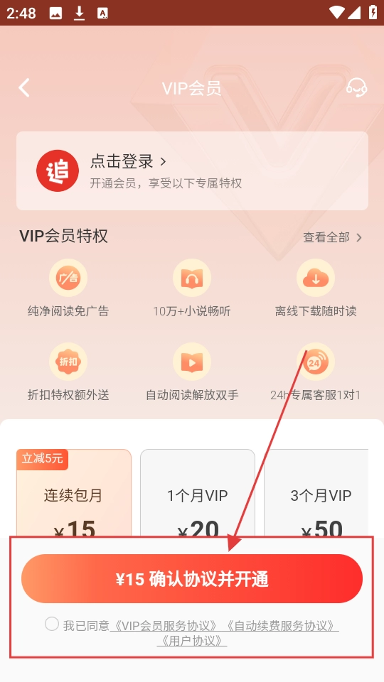 4、进入VIP会员开通页面,选择合适的会员套餐,勾选同意协议后,点击开通按钮,就能开通VIP,使用缓存等特权啦。