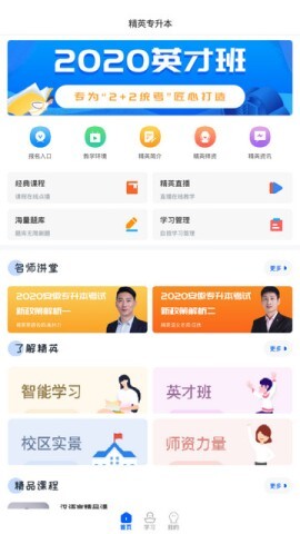 1、首次使用时,在手机上开启精英专升本应用,其界面清晰明了,包含精英简介、教学环境、师资信息等板块。