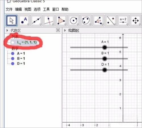 2、输入后按回车键,生成三个数字滑动条变量,可以在代数区得到列表L1,其中有三个数字。