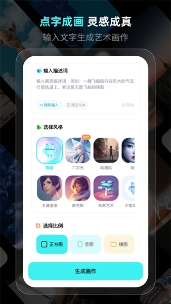 4、进入画作生成界面后,只需在描述词输入框中填入你想象的画面内容,接着选择限定的图片类型,完成这些操作后点击生成画作按钮即可。