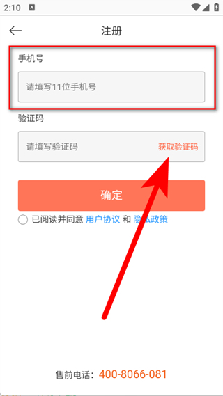 3、于注册页面处,填入手机号码,接着点击“获取验证码”。