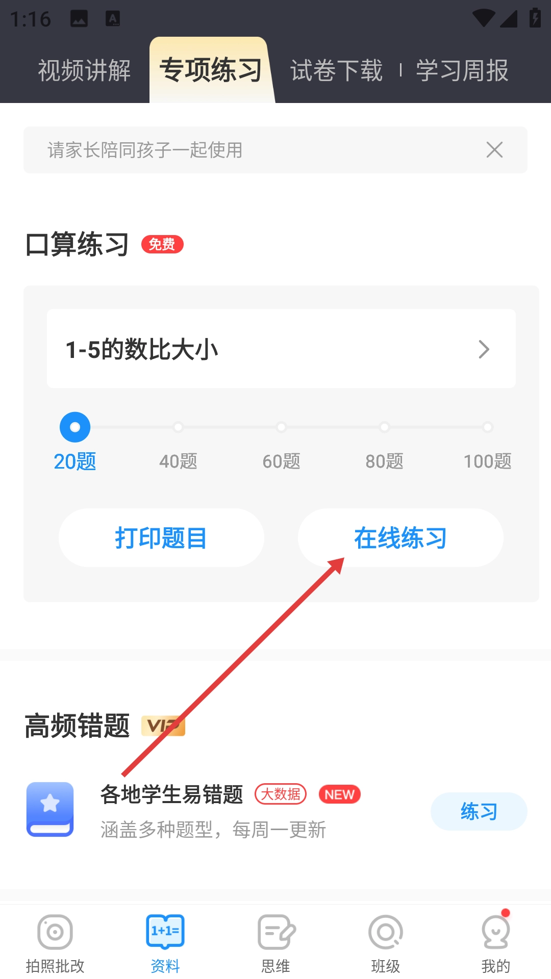 在口算练习页面选定题型与题量后,点击【在线练习】按钮。