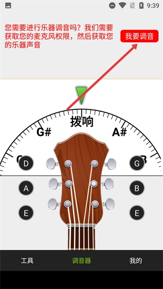 在调音器页面点击【我要调音】按钮,就能启动吉他调音流程。