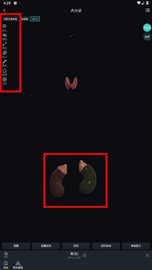 进入模型页面后,可借助左侧的功能栏对模型执行定位、调整透明度等操作,以此查看肾脏等器官的具体细节。