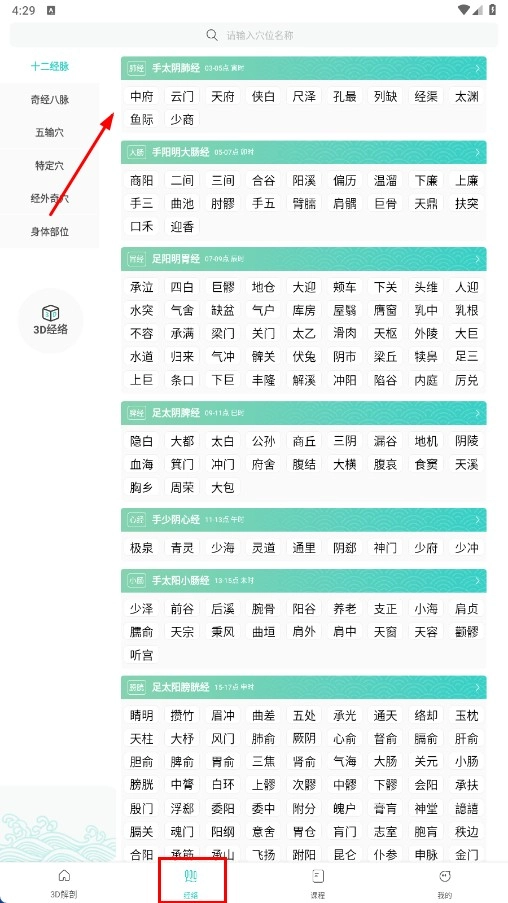 在底部找到【经络-功能按钮】并点击进入经络页面,即可查看十二经络等相关穴位信息。