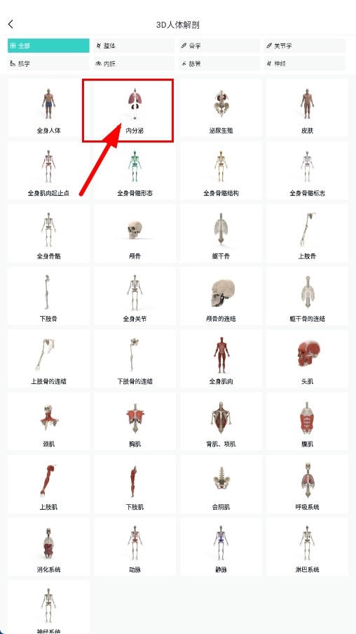 在页面中找到【内分泌-解剖分类】选项并点击,即可查看内分泌系统的3D模型。