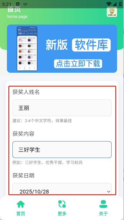 进入首页之后输入获奖人姓名以及获奖内容等信息。