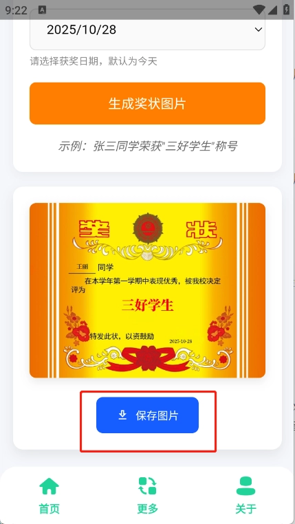 就可以看到生成的奖状截图了,点击“保存图片'.