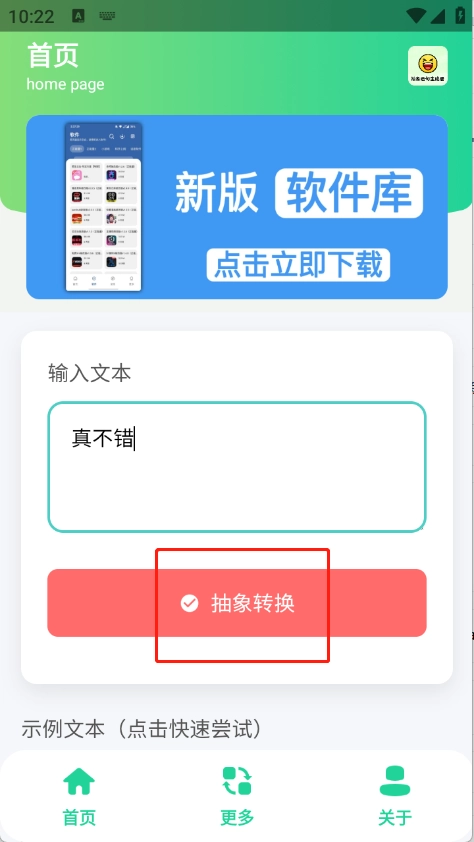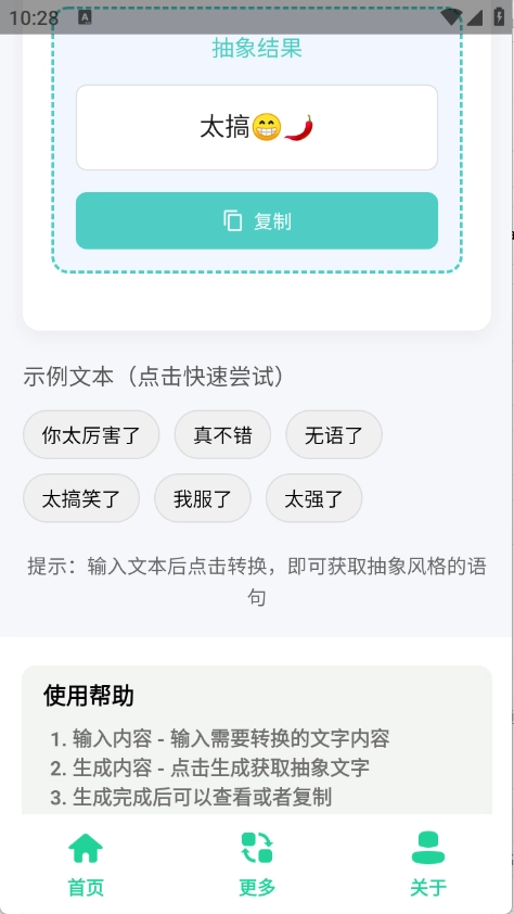 只需输入你的文字,轻轻点击一下,就能把普通的句子变成网络上流行的抽象语句,让你的表达层次得到快速提升。