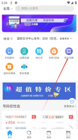 并打开号令天下,点击“号码测算”;
