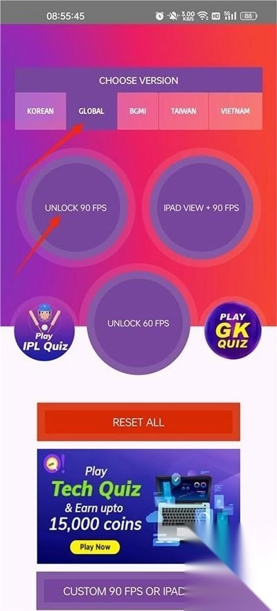 启动90fps画质助手中文版后,第一步是选择全局模式(global),接着点击解锁90帧模式。