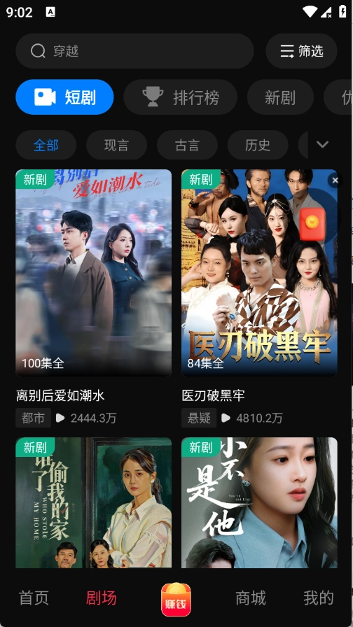 平台和不少内容合作方携手,保证每天都有海量新剧集更新。分类做得很细致,像“现言”“古言”“历史”“穿越”这些类别都包含在内,还标注了清晰的搜索热度信息(比如“搜索量100.0万”)。对短剧的核心用户来说,这就代表平台可以不断供应新鲜又丰富的“精神快消品”,来满足他们高频次的观看需要。