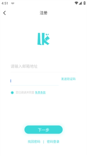 4、输入邮箱地址,点击发送验证码,然后登录这个邮箱的接收验证码。填完验证码点击下一步进行账号密码设置即可注册完成。