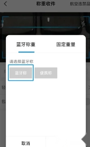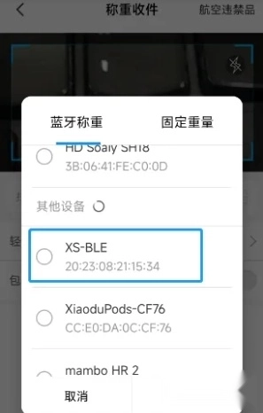 3. 在称重收件页面,点击【蓝牙秤/固定】选项进入蓝牙秤设置界面,选择【蓝牙秤】后,页面会展示手机搜索到的蓝牙设备名称及地址,从中选择“XS-BLE”;接着点击确定按钮即可。(蓝牙秤的名称和地址信息,可在秤仪表的后侧找到对应的印制内容)